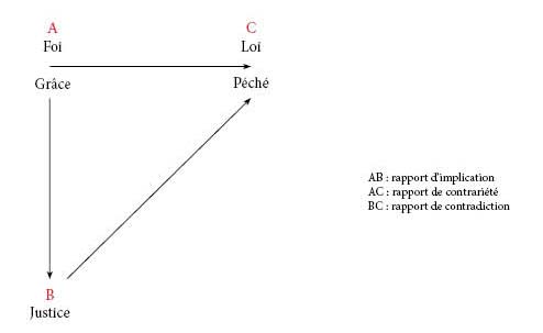Les liens entre ces trois termes sont explicités : « Nous estimons que l’homme est justifié par la foi sans la pratique de la loi. » Autrement dit foi et loi s’opposent et la justice, impliquée dans la foi, contredit la loi.